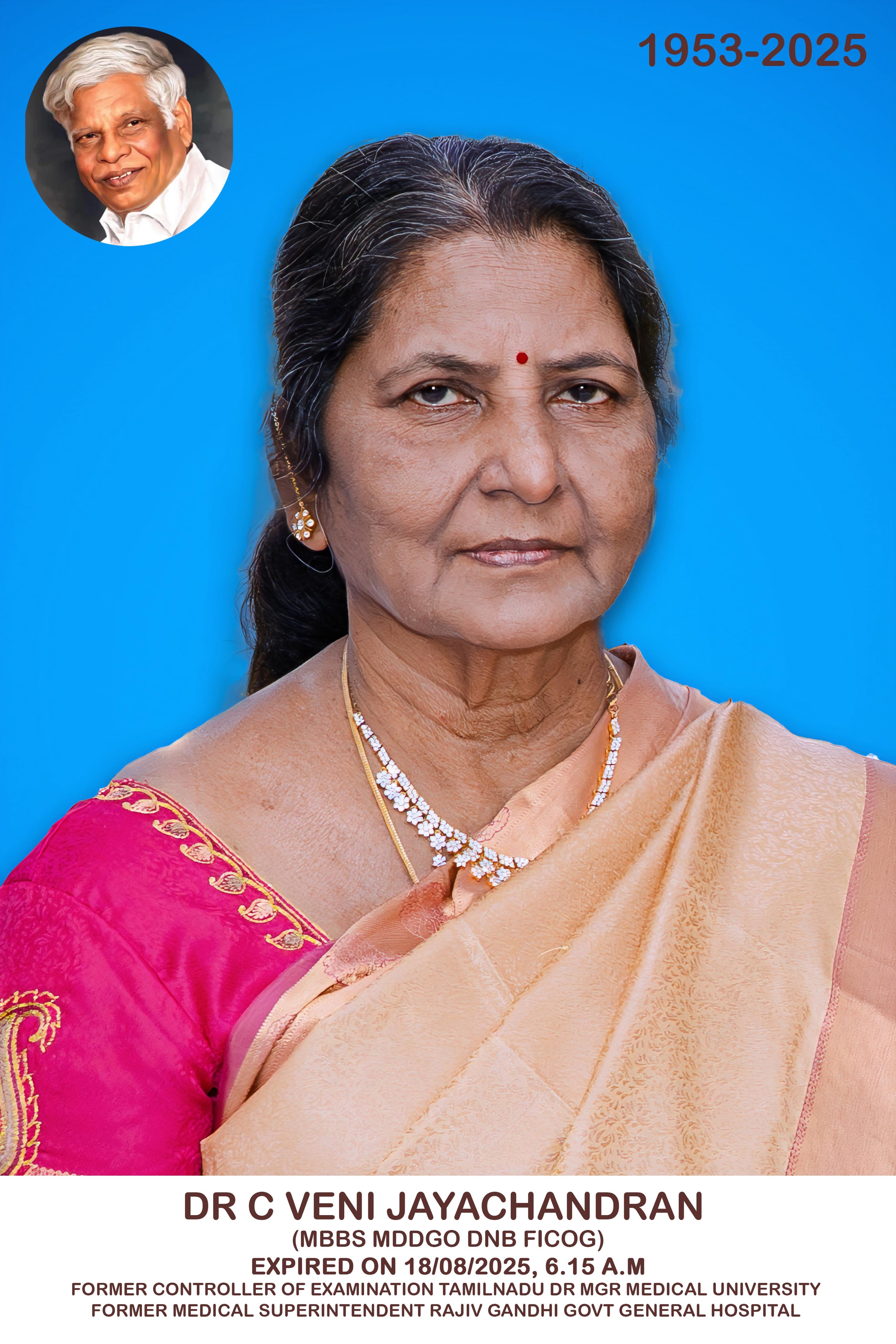 டாக்டர் திருமதி வேணி ஜெயச்சந்திரன் அவர்கள் இன்று 18.08.2025 காலை 6.15 மணி அளவில் மாரடைப்பு காரணமாக மரணமடைந்தார். அவரது உடல் பொதுமக்கள் அஞ்சலிக்காக வெங்கடாச்சலம் தெரு, பழைய வண்ணாரபேட்டை, சென்னை 21 என்ற முகவரியில் வைக்கப்பட்டுள்ளது. நாளை 19/08/2025 காலை 10 மணிக்கு அவர்களின் உடல் ஊர்வலமாக கொண்டு செல்லப்பட்டு காசிமேடு இடுகாட்டில் அடக்கம் செய்யப்படுகிறது.