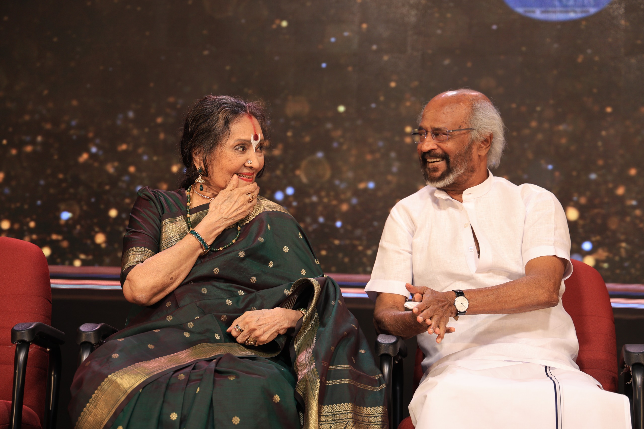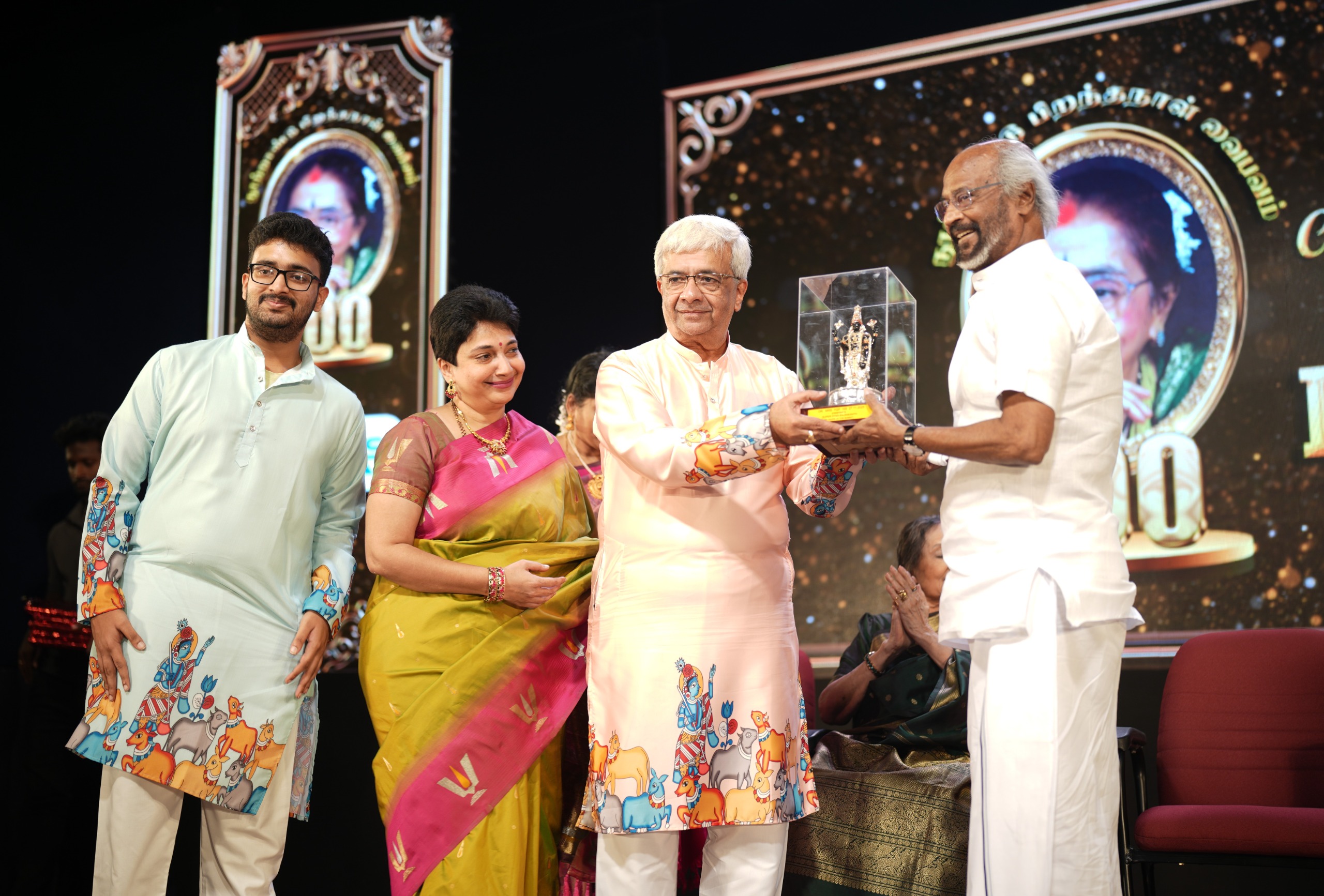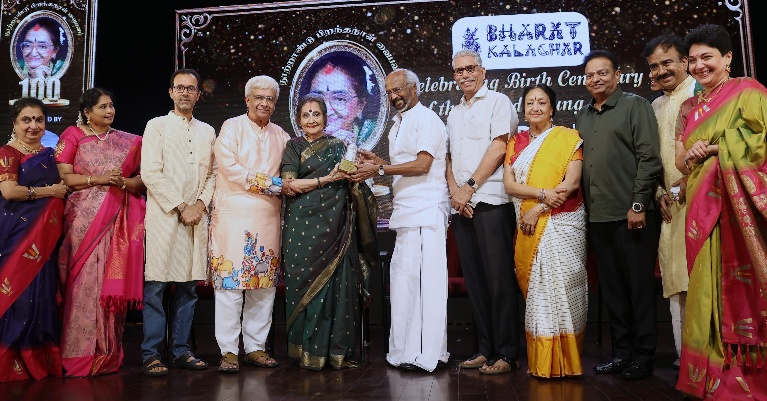 கலாச்சார மேன்மைக்கான டாக்டர் திருமதி ஒய் ஜி பி விருதை மூத்த நடிகை டாக்டர் வைஜயந்தி மாலா பாலிக்கு சூப்பர்ஸ்டார் ரஜினிகாந்த் வழங்கினார்