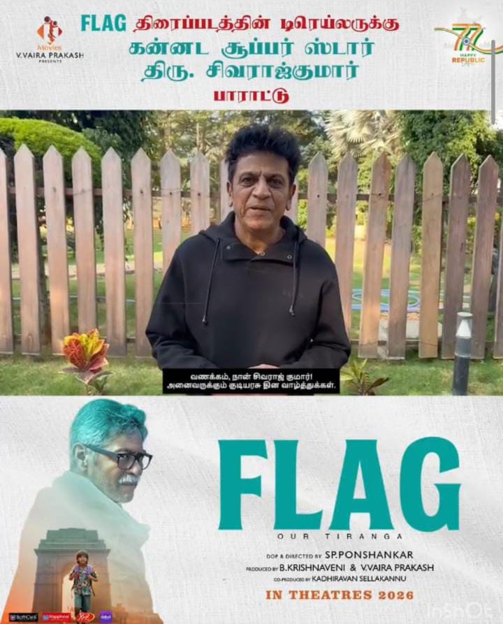 ஃப்ளாக் திரைப்படத்தின் டிரைலரை பார்த்த கன்னட சூப்பர் ஸ்டார் திரு சிவராஜ்குமார் ஃப்ளாக் திரைப்படத்தை ஒவ்வொரு இந்தியரும் அவசியம் திரையில் கண்டு மகிழ வேண்டும் என்ற தன் விருப்பத்தை தெரிவித்திருக்கிறார்.