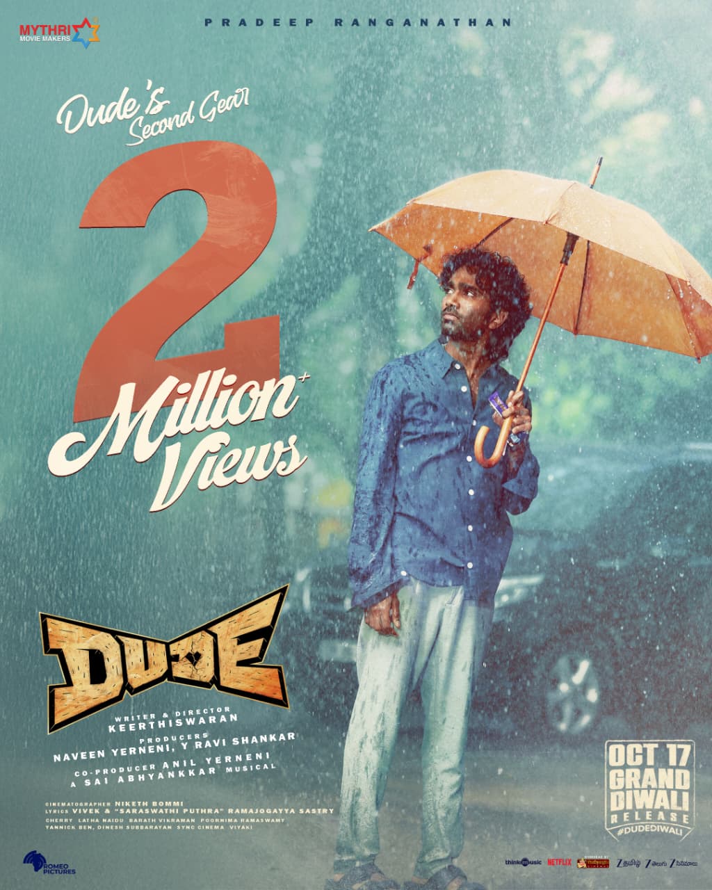 Dude is written and directed by Keerthiswaran and produced by Mythri Movie Makers’ Naveen Yerneni and Y Ravi Shankar. Alongside Pradeep Ranganathan and Mamitha Baiju, the ensemble cast includes R. Sarath Kumar, Hridhu Haroon, Rohini, Aishwarya Sharma, and Dravid Selvam, among others.
